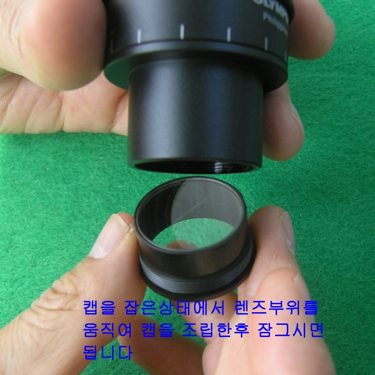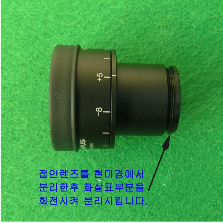 접안렌즈를 현미경에서 분리한 후 캡(사진에서 화살표 표시부분) 을 회전시켜 분리합니다.