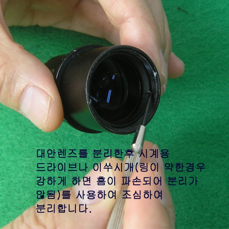 대안렌즈를 분리후 소형 드라이버를 사용해 내부 링을 조심스럽게 분리합니다. 무리한 힘을 주지 않습니다.